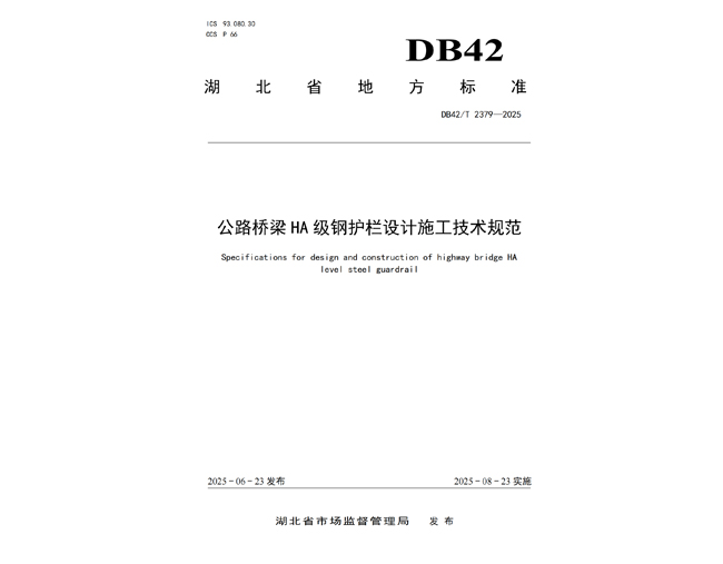 主编湖北省地方标准《公路桥梁HA级钢护栏设计施工技术规范》DB42/T 2379—2025